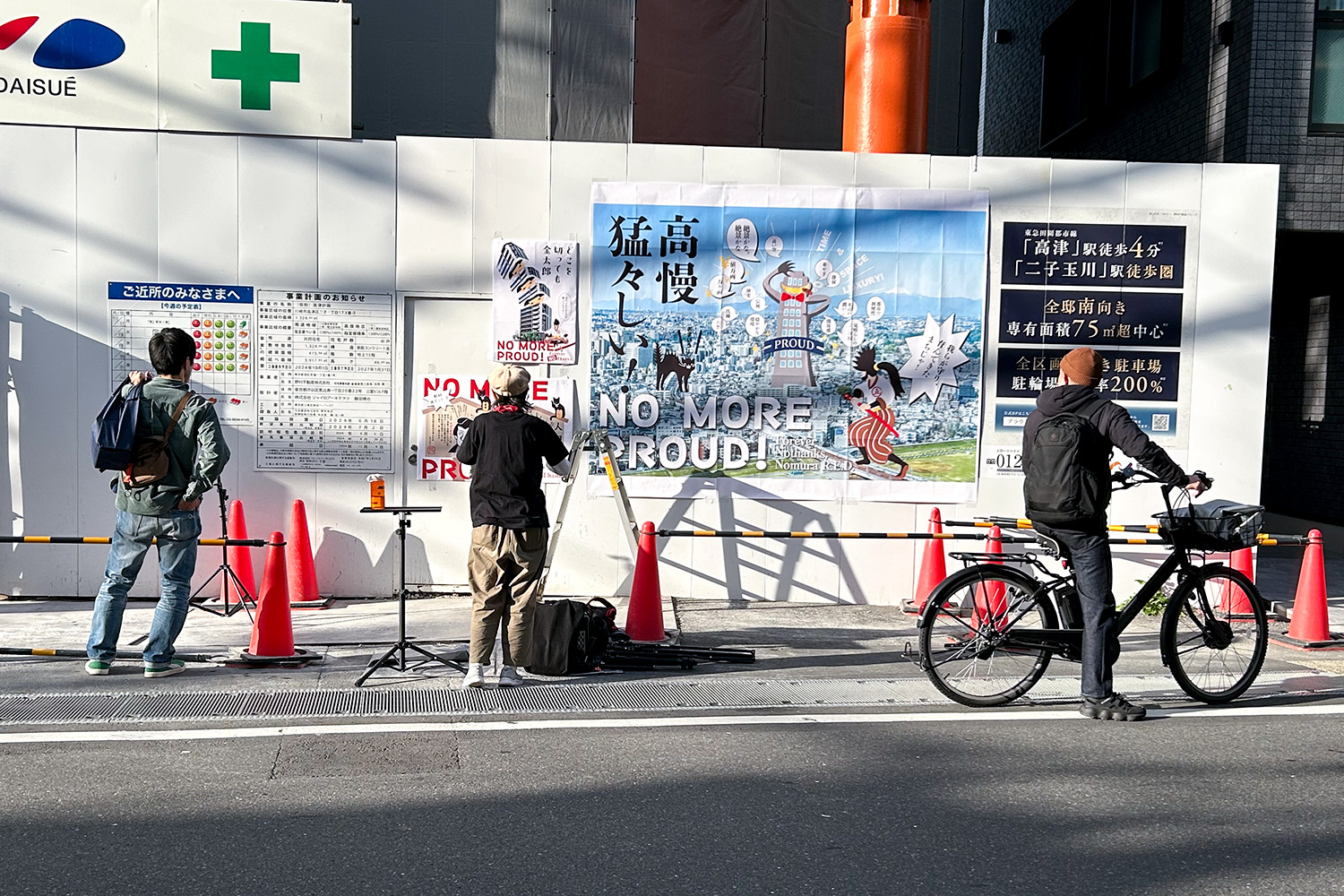 というわけで、現場フェンスの「プラウド」看板を「ノーモア・プラウド」の看板に貼り替えるというパフォーマンスをメインにすることにしました。縦180cm×横260cmの巨大看板を、A3プリント用紙45枚をつなぎ合わせて完成させました。