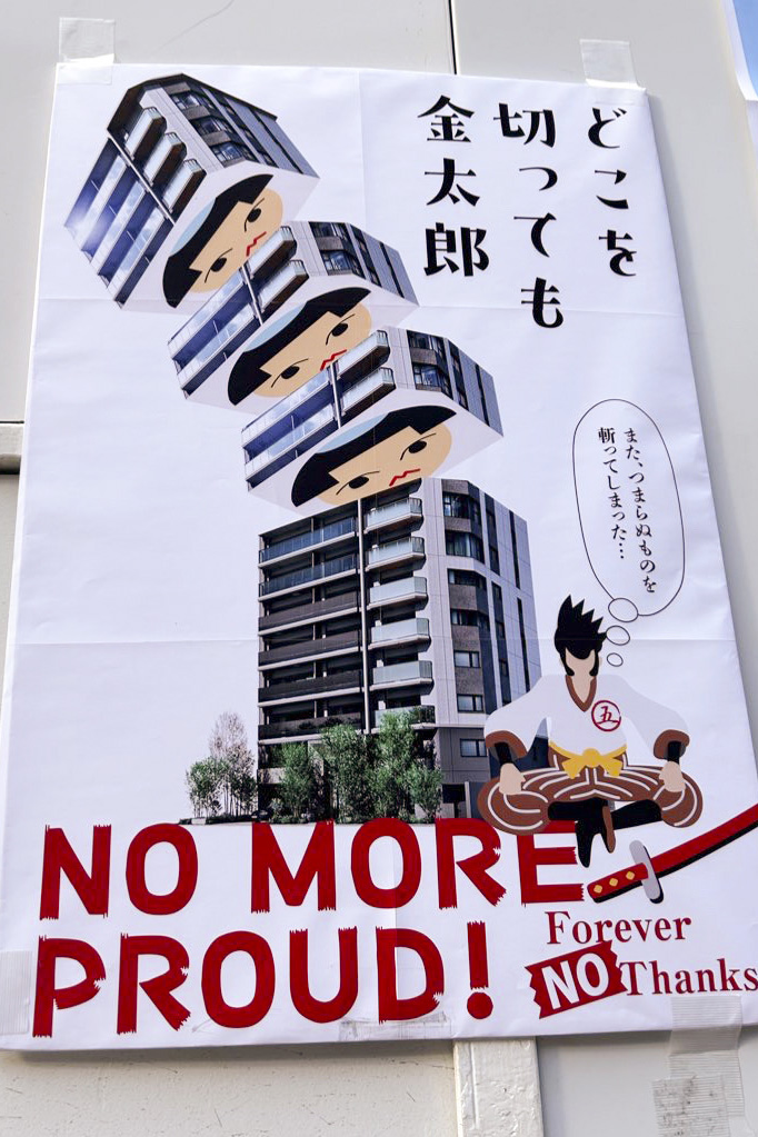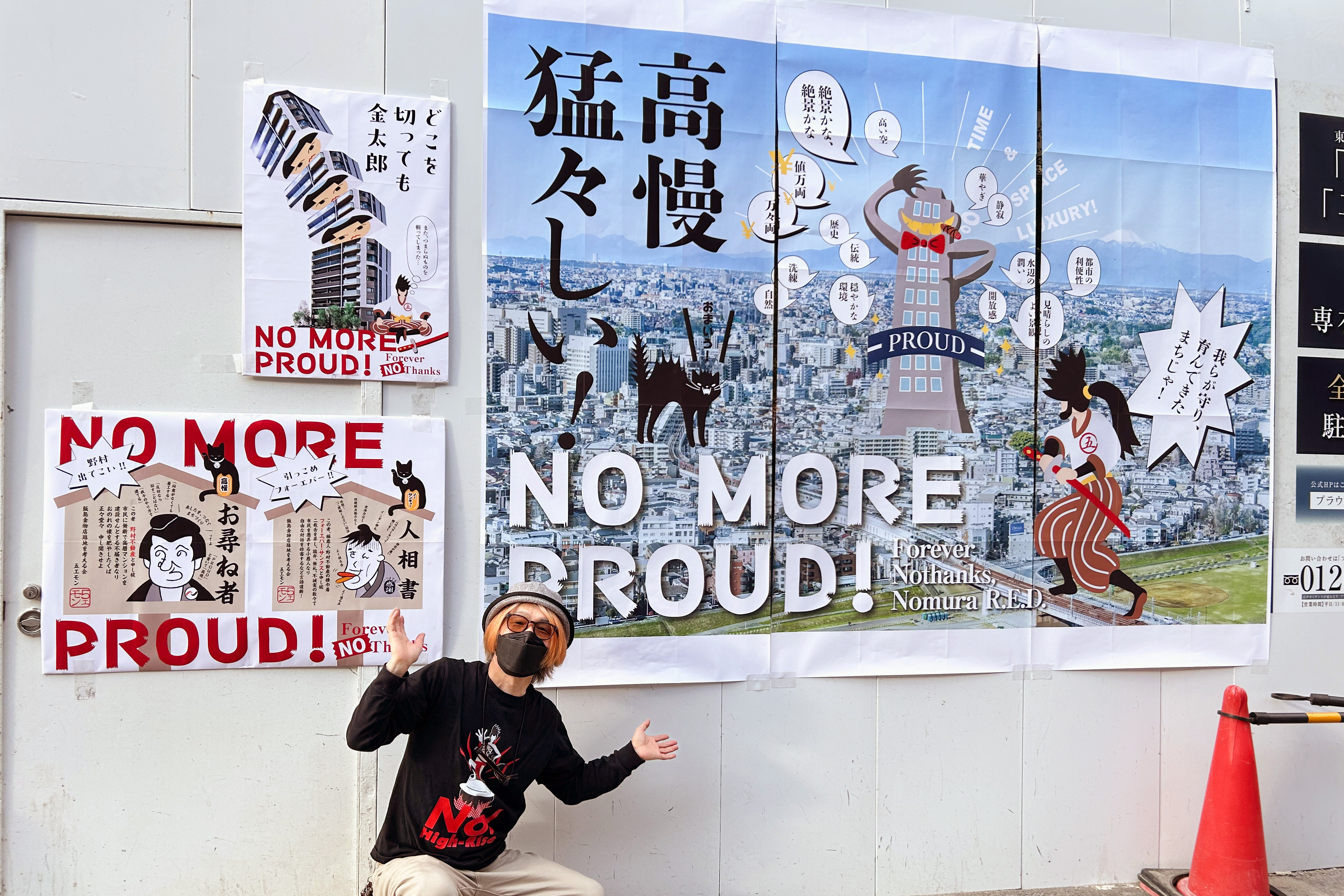 高慢ちきな「PROUD」看板を「NO MORE PROUD(プラウドいらない)」に描き替え(貼り替え)た。彼らが私たちの町に敬意を払わず、誇りまでをも踏みにじるなら、こちらも同じことをやり返すまでのこと。「倍返し」だ!