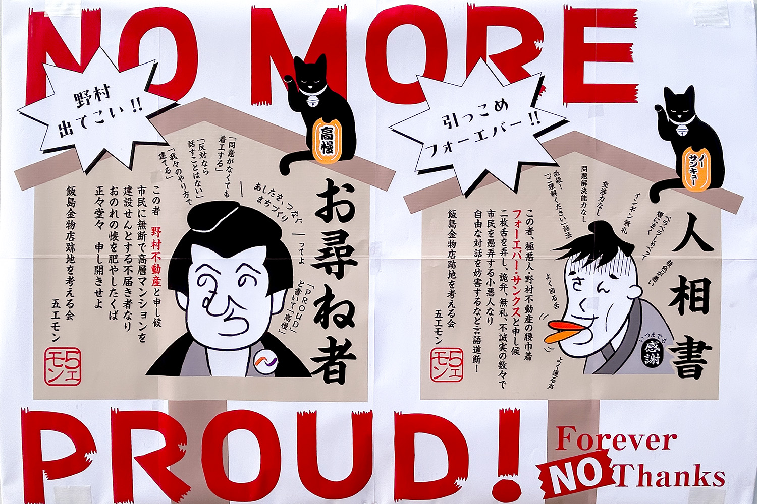 もしもこのまま、何事もなく竣工したとしても、反対運動が根強く続く抗議の的のマンションに住みたいと思う人がどれだけいるでしょうか。不利益を押しつけられ、将来にわたって多大な迷惑を被り続ける地域の人たちと、新規マンション入居者の間で、果たして良好な人間関係が築けると思うでしょうか。普通に考えて「居心地が悪い」と感じるのが、当たり前の感情でしょう。そうやってマンション購入を断念する人が増えれば、野村は赤字を出すことになります。そうでなくても採算ギリギリの計画です(資材や人件費の高騰ですでに赤字かも?)。反対運動を「見える化」することは、マンションを「売れない化」することに繋がり、これは利益第一主義の野村不動産が最も嫌がることでしょう。