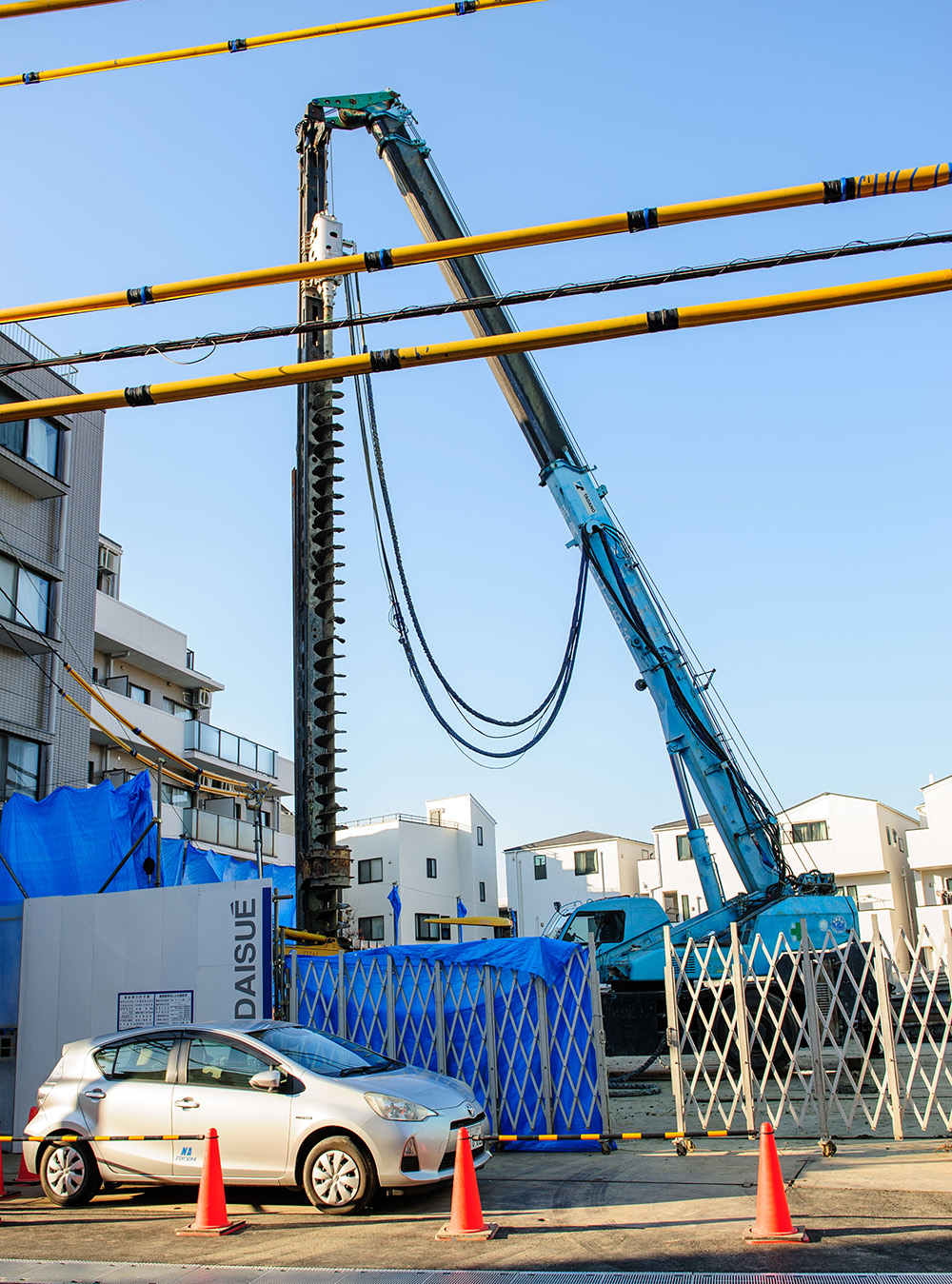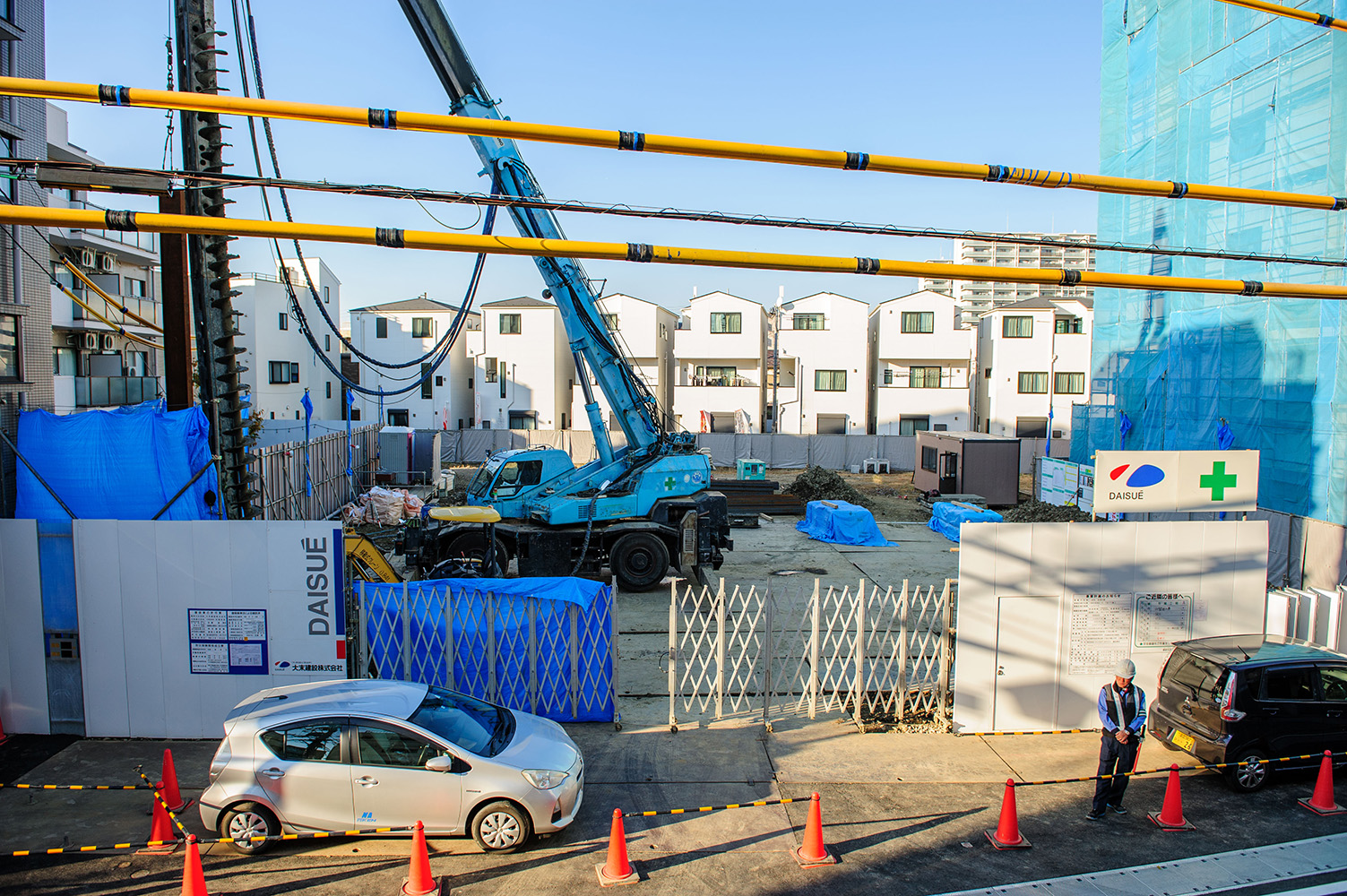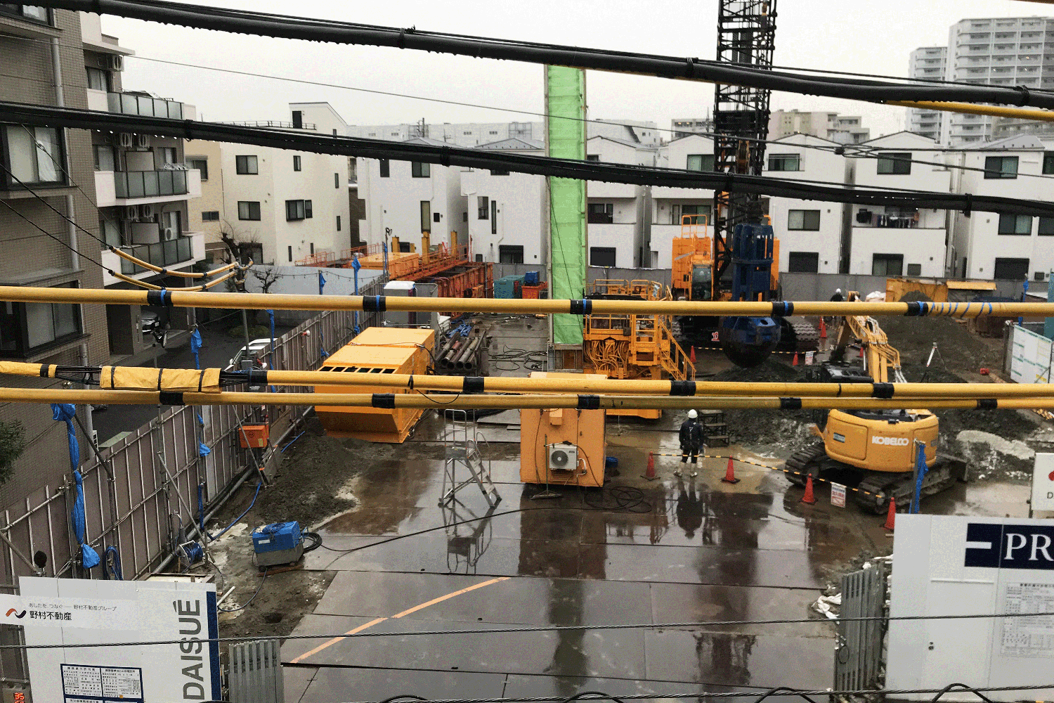 この辺りは軟弱地盤のため、この作業がいい加減だと後々大変なことになってしまいます。これら一連の基礎的な工事が、これから約半年余り続きます。騒音と振動が最も懸念される工程です。しばらく見ていると騒音計は瞬間的に85dBを超えることもありますが、体感的には我慢できないほどの騒音ではありませんでした。ただ、これからもっと騒音・振動の激しい工程も控えていますし、この状況が延々半年も続くとなれば、精神的なストレスはどうなのでしょう…?