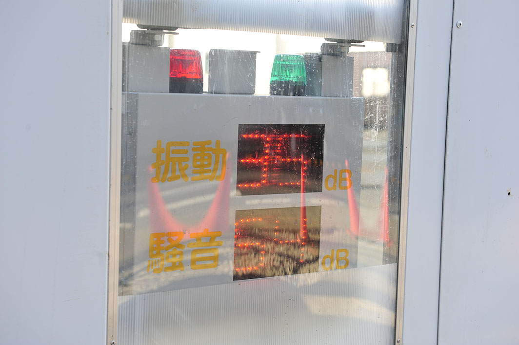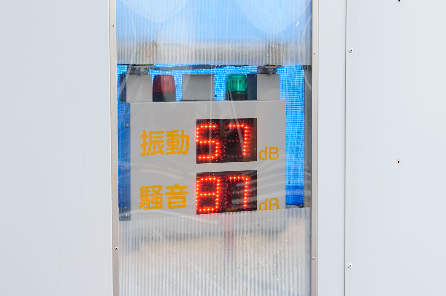 道路側の正面に騒音・振動計が設置されていました。時々車や人が通る程度の通常時で「振動35dB/騒音54dB」。これが工事中だとどのくらいになるんでしょうか。規定は、「振動75dB以下、騒音85dB以下」です。作業中うるさいなと思ったら騒音・振動計をチェックして、もしこの数値を超えていたら即、文句を言いましょう。
