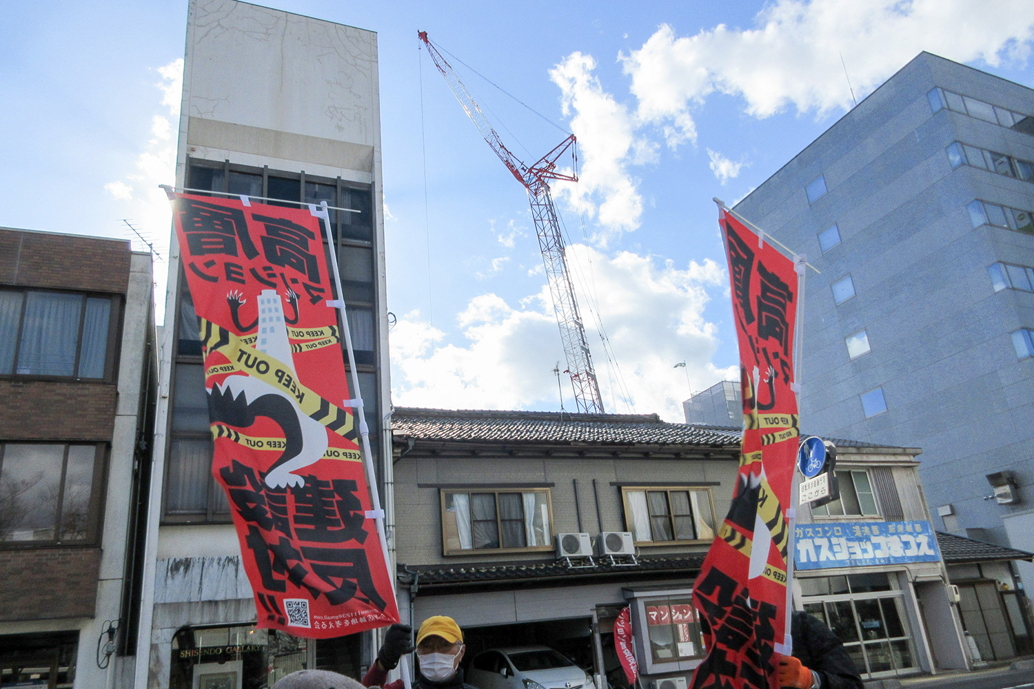 先日の12月7日、工事に抗議するデモ行進を決行、そこで私たちが制作した「高層モンスター」ののぼり旗が掲げられました。