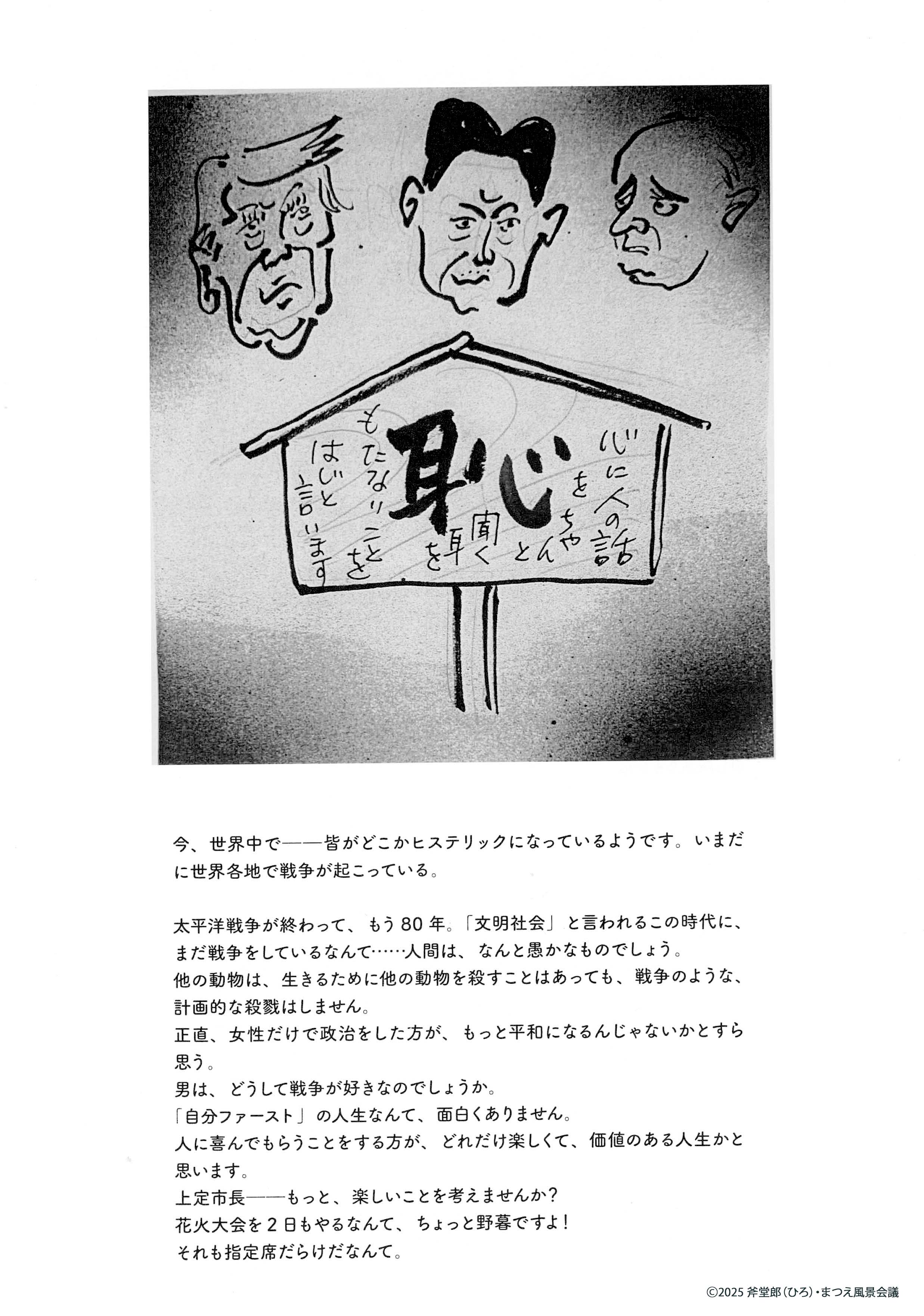 これは実は、まつえ/風景会議のアーティスト・安食ひろさんの活動に感銘を受けて、その手法に倣ったものです。なにしろ眉間にシワを寄せた悲壮感漂うような訴えにはしたくない。みんなも一緒になって楽しめるようなアピールでなければ、興味も持たれないし共感も得られないと思うからです。