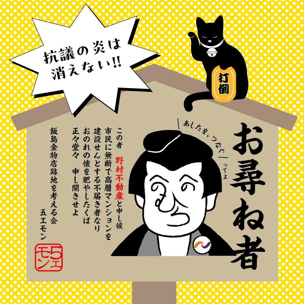 この「粋」な抗議に対して、市からは「高札の脚が50cmを超えていて条例違反だ」というあまりにも「無粋」な反応だったとか。地上60mのマンション建設を許可しておきながら、高札の高さ数cmに目くじらを立てるとは、いかにも四角四面のお役所らしい見事なオチです。小言幸兵衛、我が意を得たり。無粋な石頭どもを、怒りを込めて笑い飛ばしてやりましょう。
