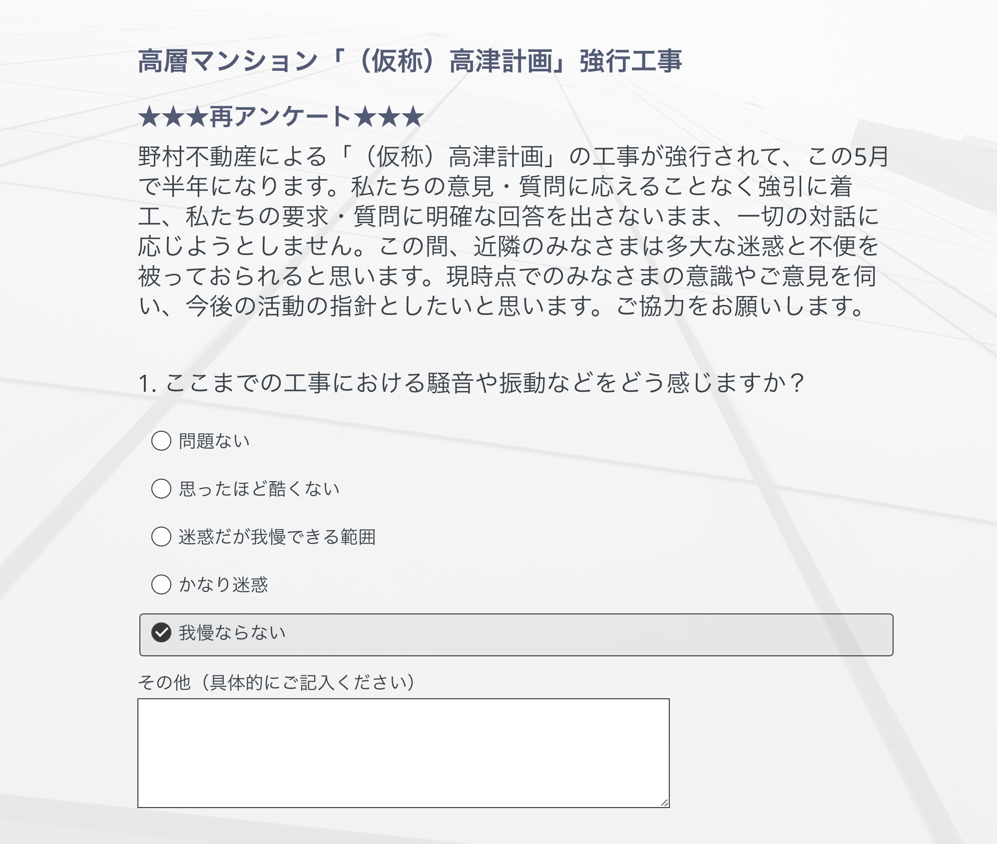 もしもこの先、私たちが指摘した通りの事故や問題が起きてしまったとき、私たちが訴え続けてきたという事実、それを野村不動産が無視し続けてきたという事実の積み重ねが、彼らを叩く武器(証拠)になり得るのです。「要望がなかった」「想定外だった」「ちゃんとやっていた」という言い逃れを封じることができるのです。100回訴えて100回無視されたら、その回数だけ野村の悪質さが上積みされるのです。無駄な努力ではありません。