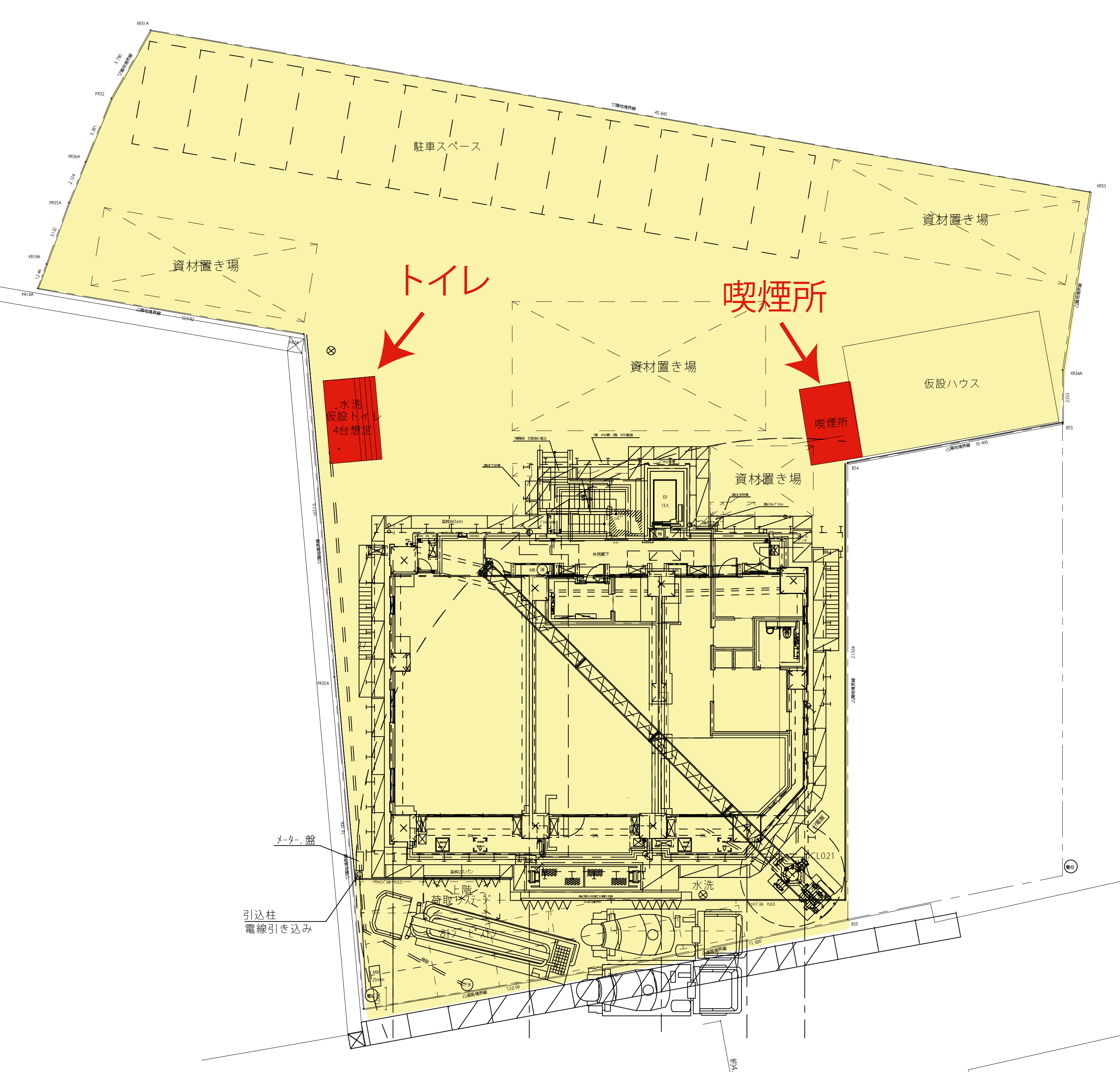 打設工事と生コン車の待機場所については確認しました。喫煙所も当初はトイレの隣(側溝通路沿い)だったのを少し離れた場所に変えてもらっています。トイレについても排水のことを考えれば側溝沿いのこの場所はやむを得ないのでしょう。