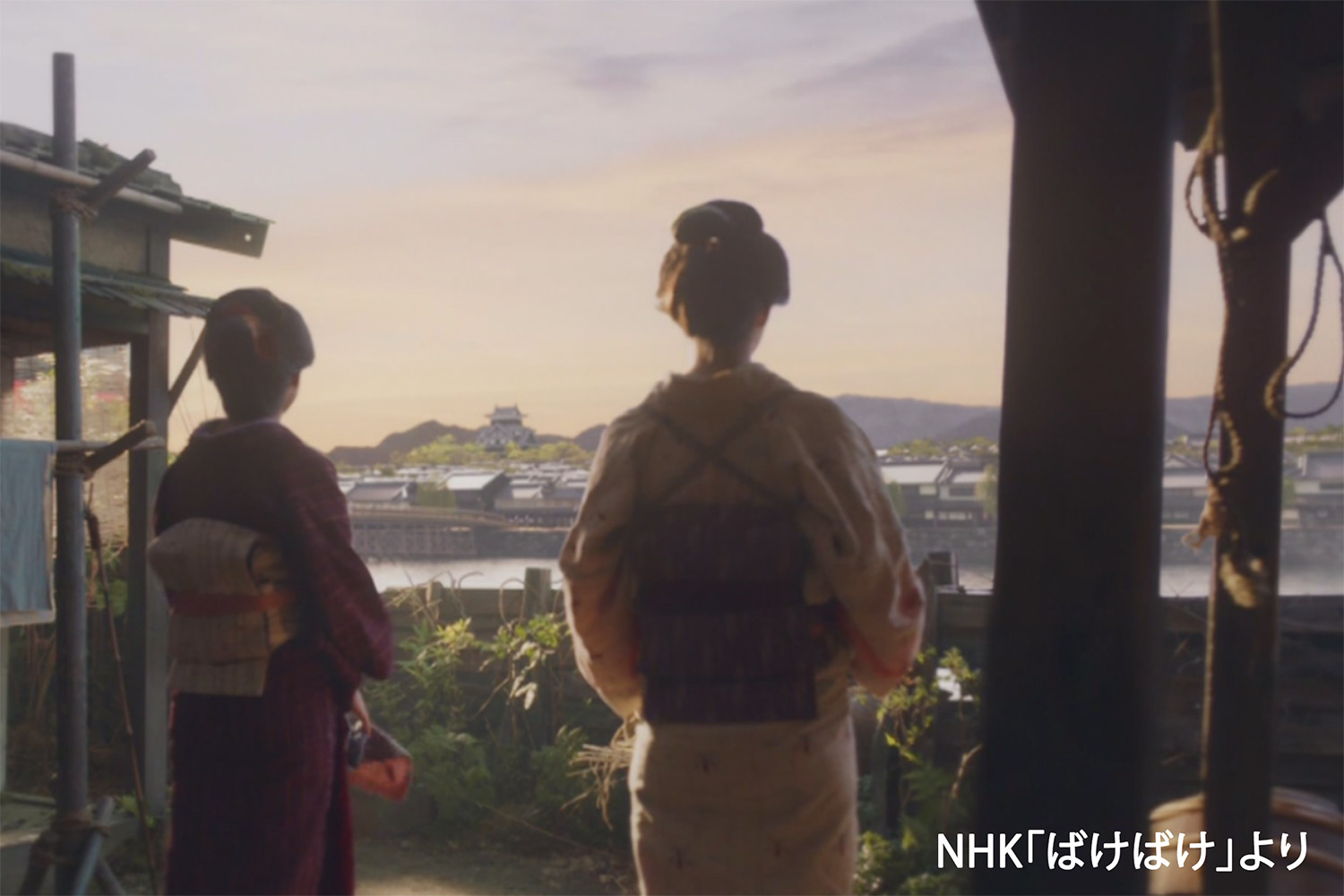 松江の景観の昔と今。お城を囲む堀川越しに城下町を眺めるおトキたち(「ばけばけ」より1場面)。それよりお城に近い場所に、お城を超える高さのタワマンが建設中。松江の人たちが長年愛し守ってきたこの「景観」は、いったい誰のもの?!
