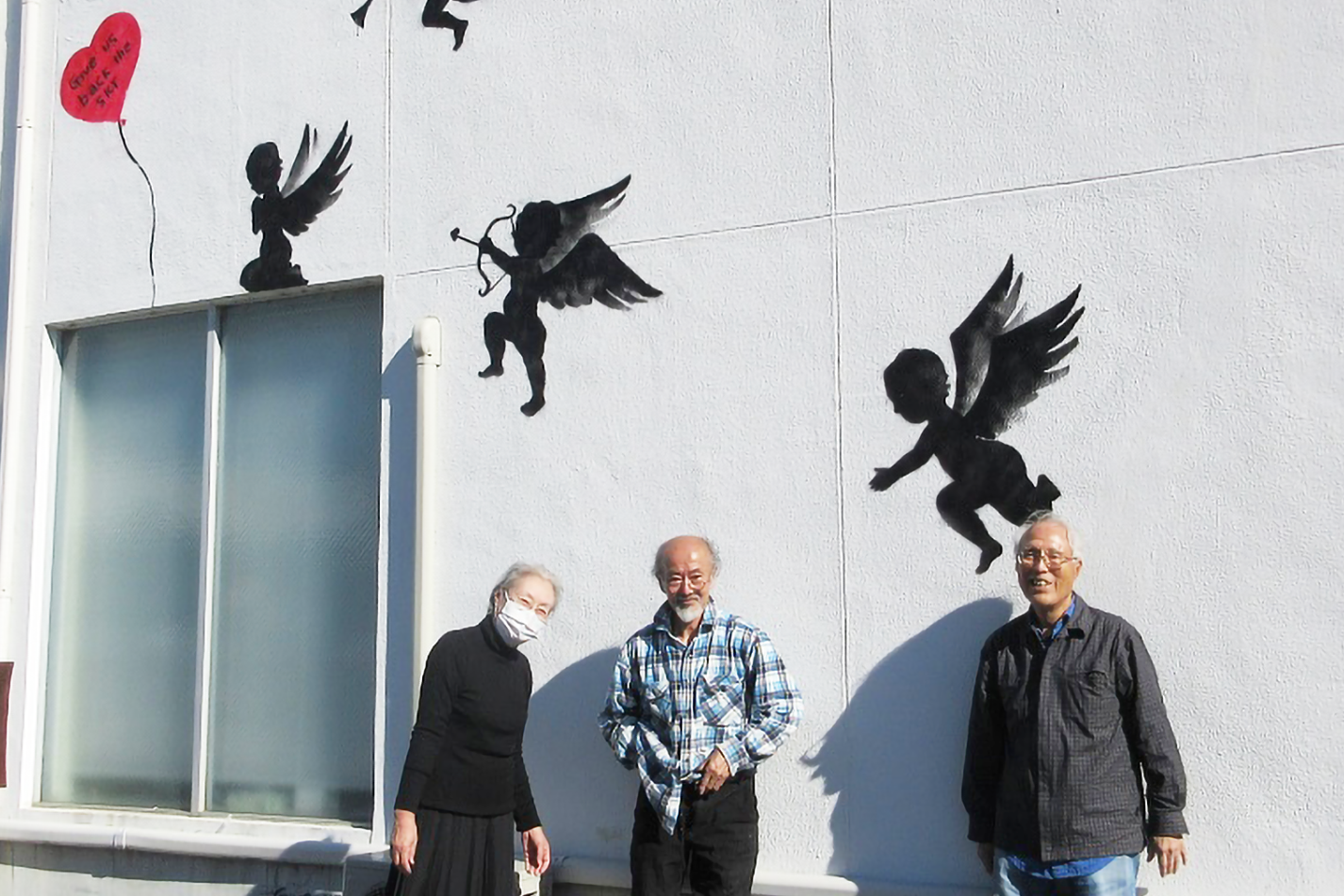 「天使の壁画」もそのひとつで、3階建ビルの壁面を好きに使ってよいという許可をもらって、この絵を描いたそうです。天使たちがマンション建設現場に向かって「空を返して」という切実なメッセージを投げかけ続けています。また、手をさしのべている天使と手をつないだ写真を撮って、共感の輪を全国に広めてほしいとの願いも込められています。