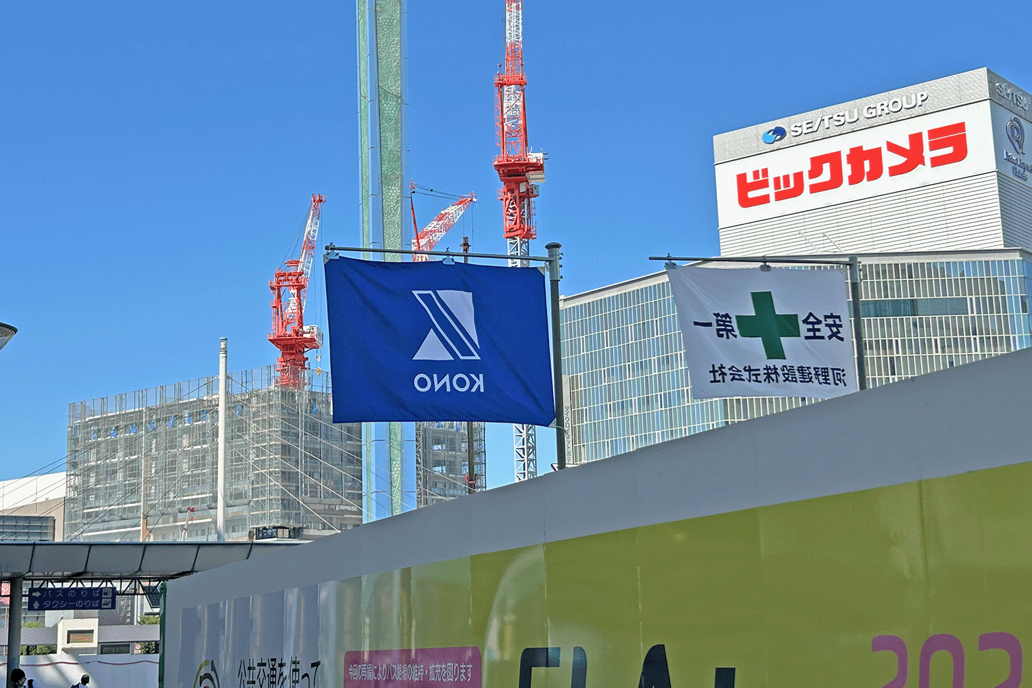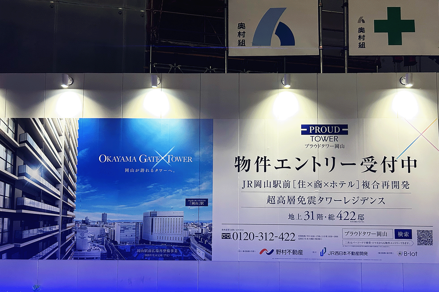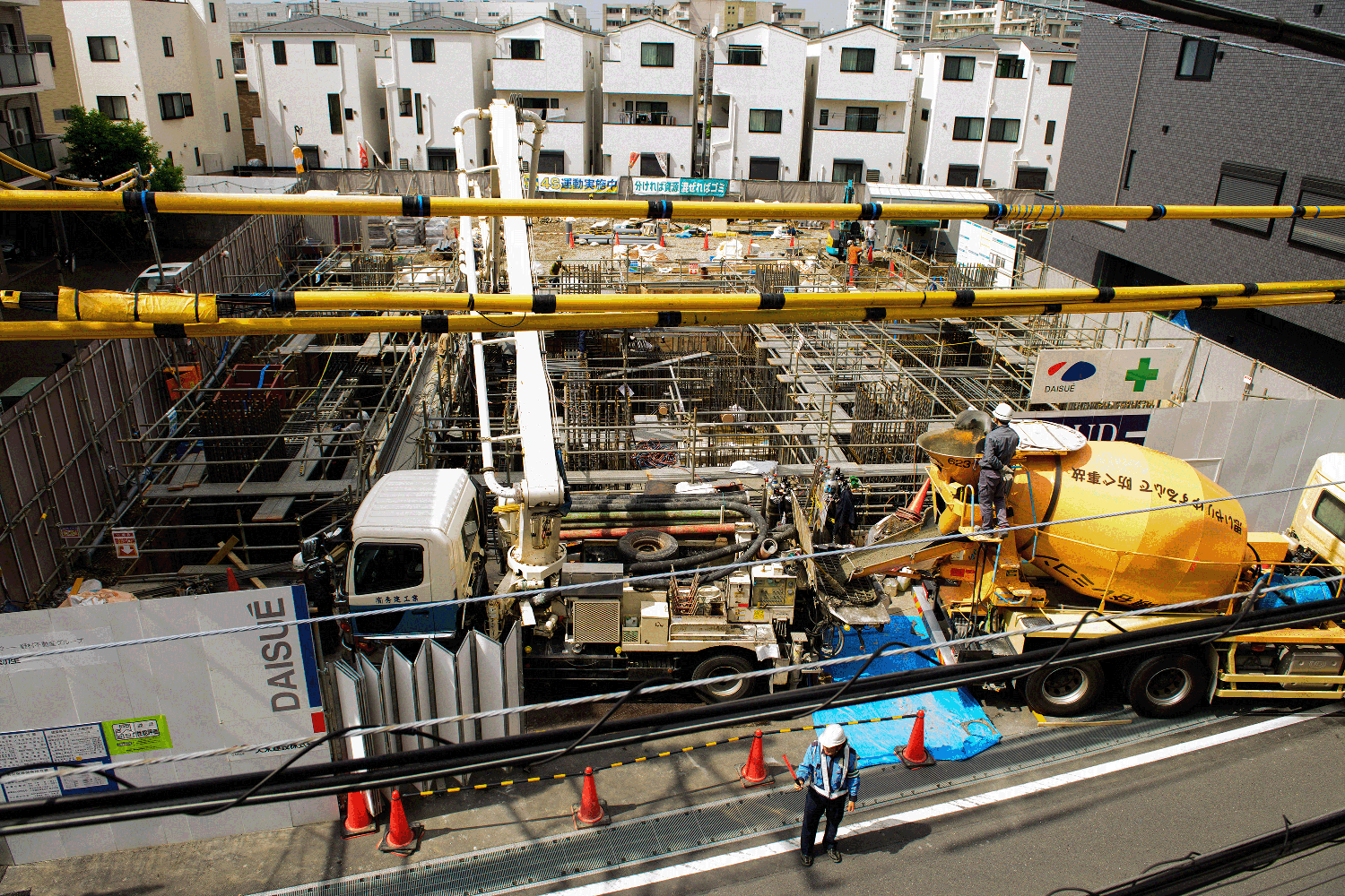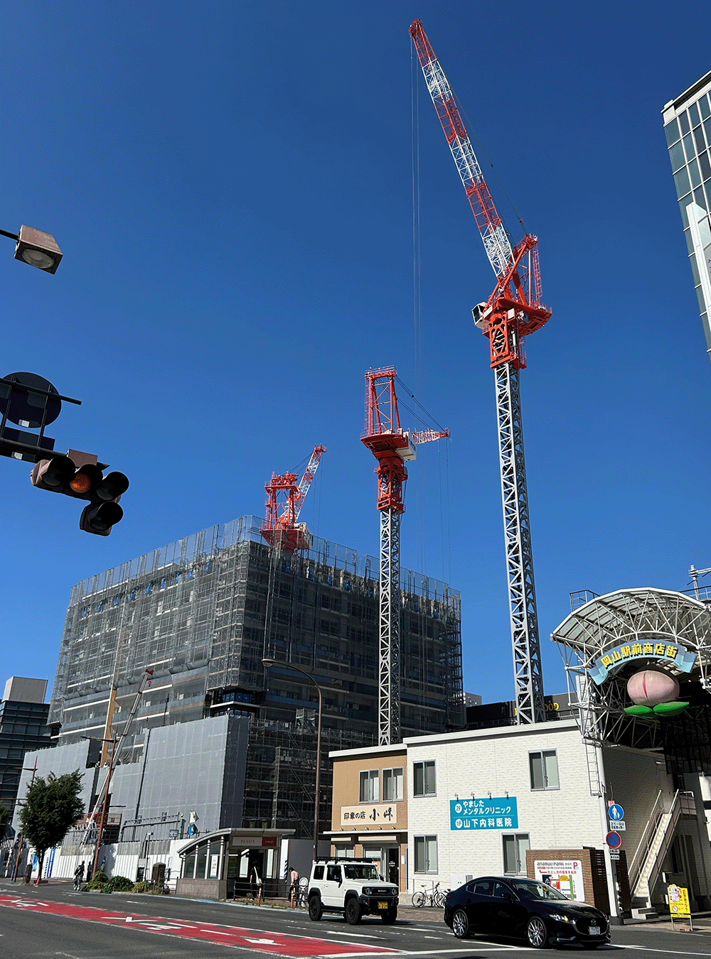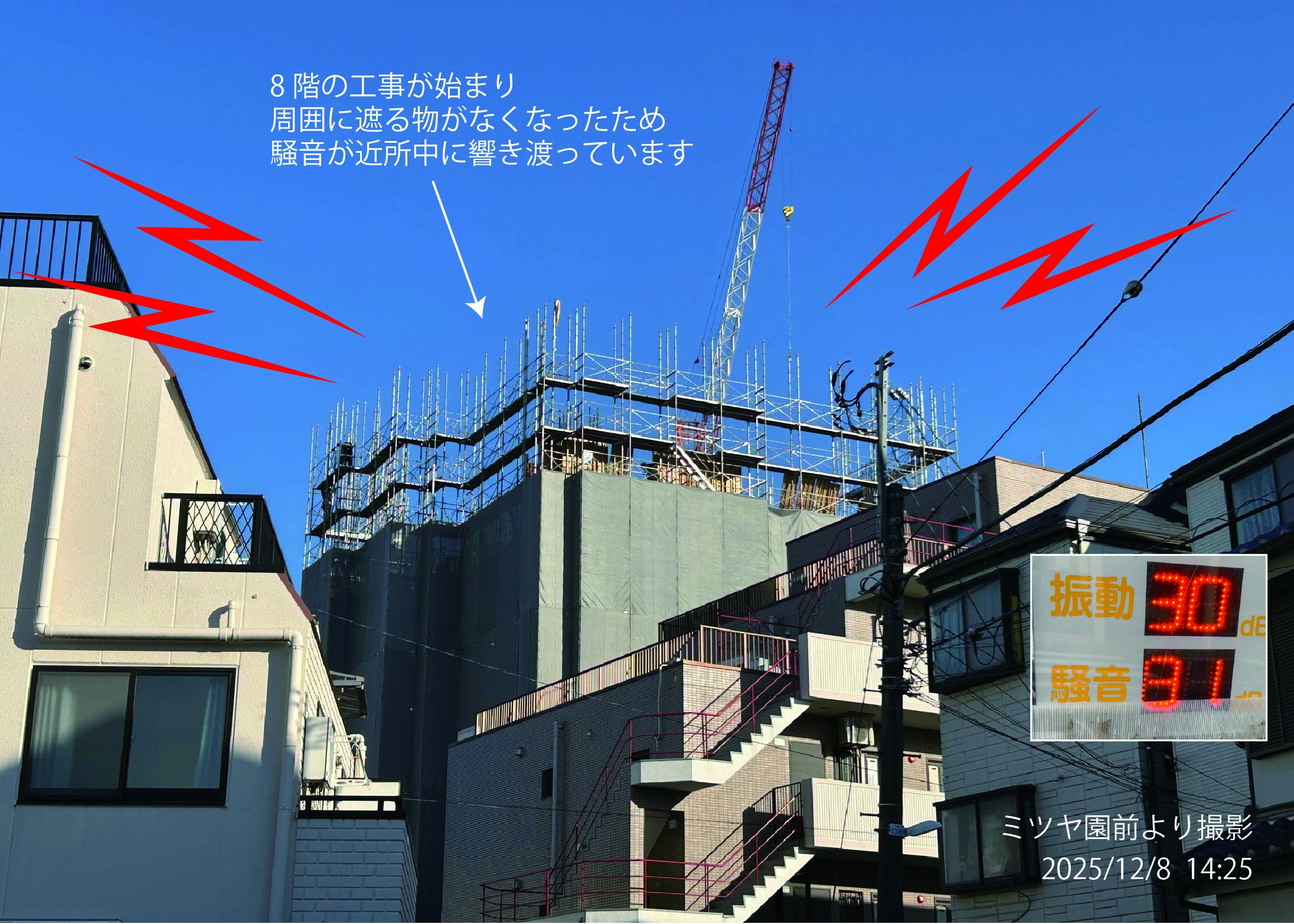 周囲の建物の間からニョッキリ頭を出した野村プラウド。遮るものがなくなったため、作業による騒音が今まで届かなかった場所にまで届くようになった。耳障りな金属音はあちこちに反響して、騒音計の数値以上にうるさく感じる