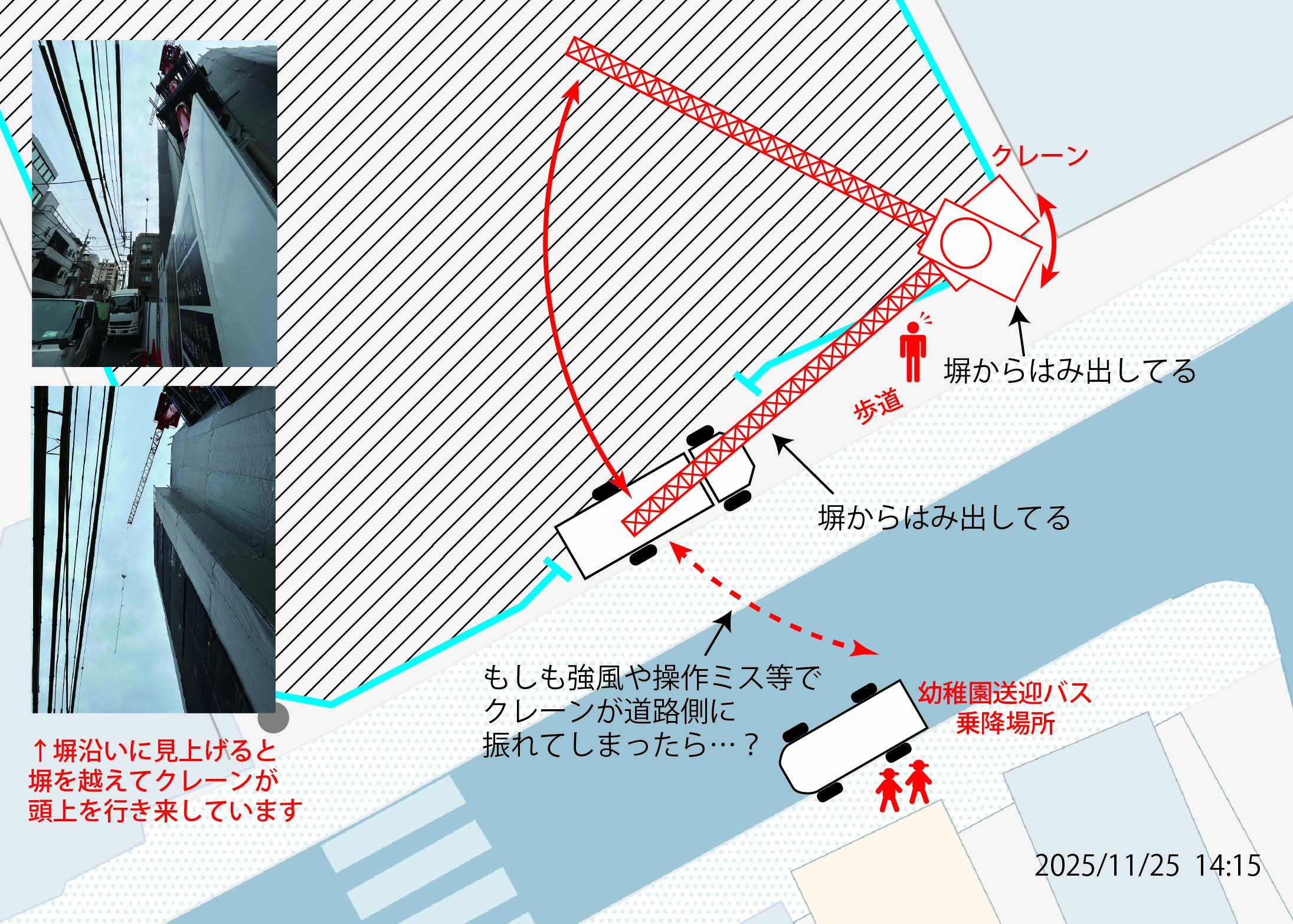 しかもその時、ちょうどすぐ真向かいで幼稚園の送迎バスが子どもたちを降車させていました。ここが毎日の乗降場所なのでしょう。もしも停車中に突風や操作ミスでクレーンが少しでも道路側に振れてしまったらと思うと、ゾッとしました。