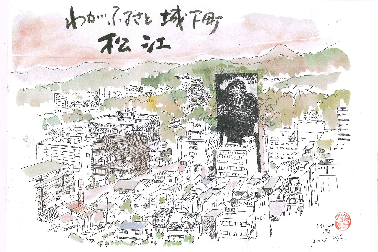 実は「まつえ/風景会議」事務局の方が当HPをご覧になり、こののぼり旗を注文してくださったのです。代表の方が松江城下に建てられようとしている高層マンションを「ゴジラ」に例えられていることもあって、この絵柄を選んでくださったそうです。