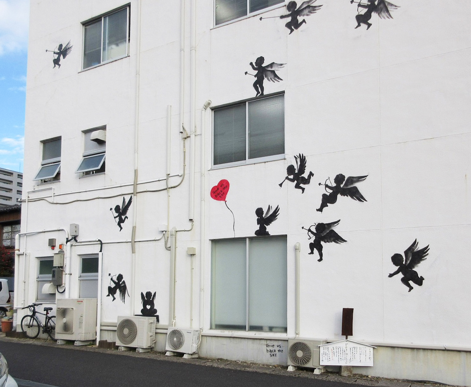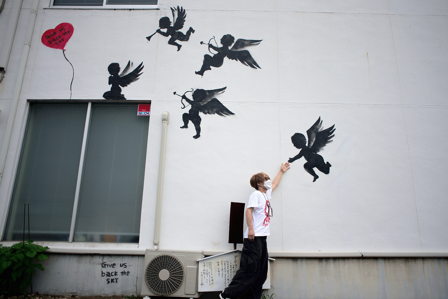 白い壁面いっぱいに天使たちが飛び交う壁画「give.us.back.the.sky」。独特のウィットとセンスで強烈に社会を風刺する覆面作家バンクシーを彷彿させるこの作品の作者とは?