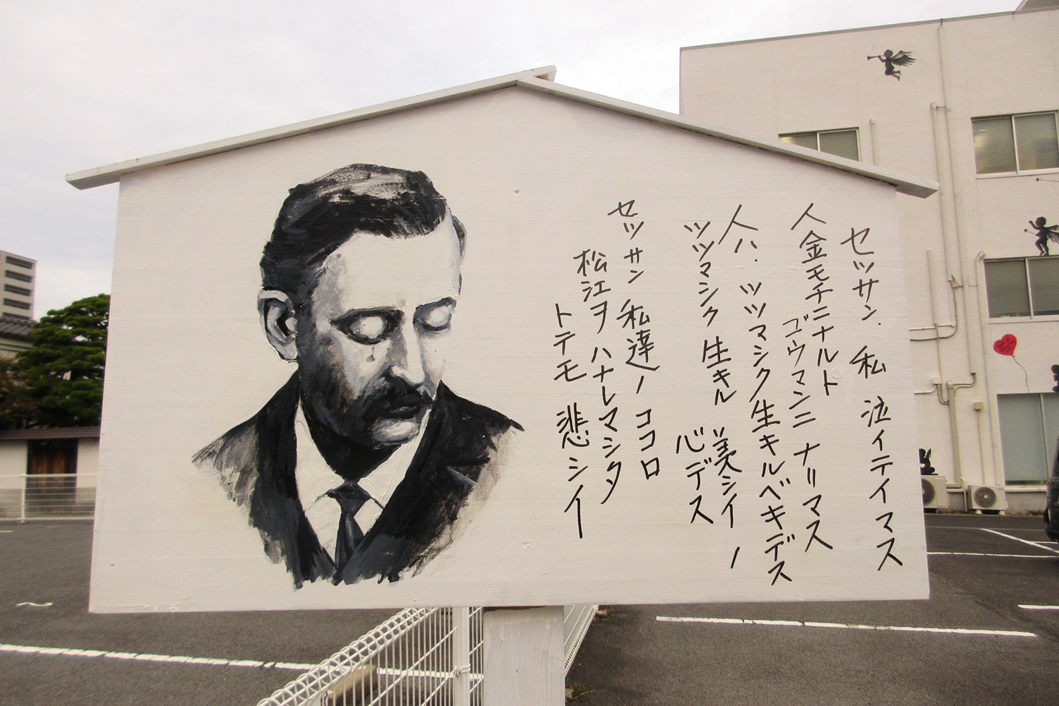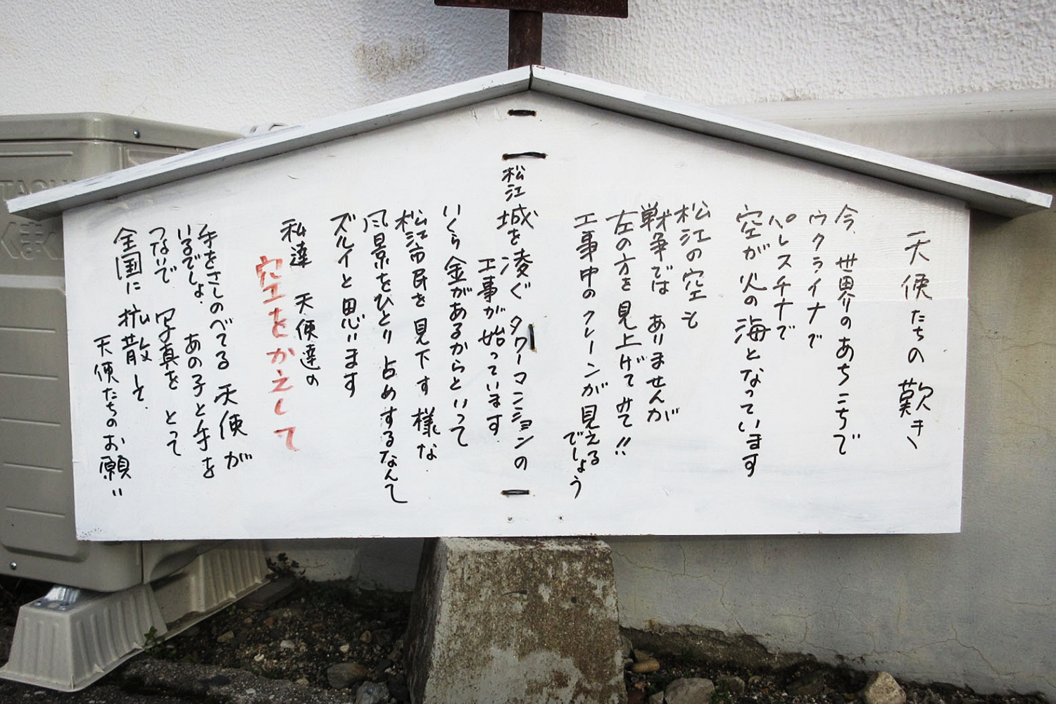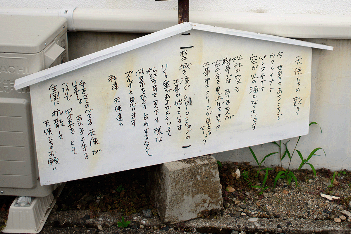 そこから少し歩いて裏手の「天使の広場」を訪れてほしい。お城とタワマンの対比を一望できます。町の崩壊を嘆く天使たちや、ヘルン先生、セツ、耳なし芳一と出会うことができます。彼らの悲しみの声を聴いてください。そして一緒に声を上げてください。一人ひとりの声が力になります。