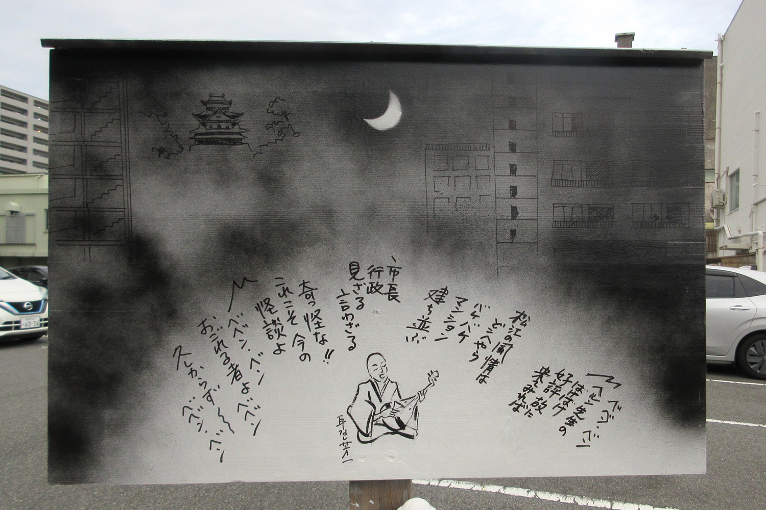 タワマン建設現場裏の「天使の広場」に新しく設置されたひろさん制作のセツ&ヘルンの高札。芳一もベベン♪と現代の松江怪談を歌い上げる。現代の"ばけもの"は夜の闇に潜むのではなく、白昼堂々、轟音と振動とともに現れる。底なしの欲望をむき出しにして。
