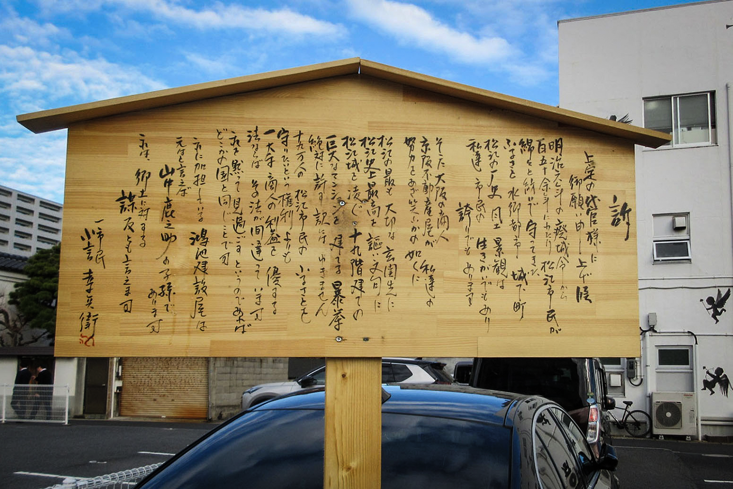 江戸から続く城下町の風景を守ろうというメッセージを「高札」で表現するというのは、たしかにとても「粋」なアイデアです。ユーモアもあり、古風な高札は城下町の風情ともマッチします。圧倒的な権力に非力な市民が対抗し続けていくには、揺るぎない反骨精神はもちろん、こうした権威を笑い飛ばす機知と「粋」の精神が欠かせないということに、あらためて気付かせてもらった気がします。